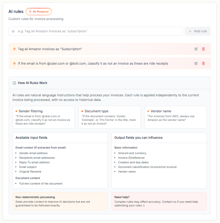 The Premium plan at $138/month covers 12,000 invoices annually across unlimited connected email accounts with 8-hour priority support and the Email Routing add-on included. Furthermore, Tailride supports custom AI rules that can be configured in minutes. For instance, rules can automatically tag invoices by project, exclude specific vendors, set tax rates, apply due date logic, and handle invoice type filtering. One-time credit bundles that never expire are also available for burst workloads or seasonal volume spikes.