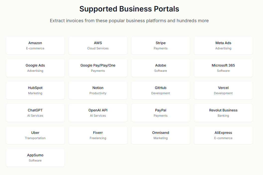 The Tailride Chrome extension supports 20+ portals including Amazon, Meta Ads, Adobe, Notion, Microsoft, and ChatGPT. Furthermore, it uses your existing browser session to retrieve invoices, so you never need to share portal login credentials with Tailride.