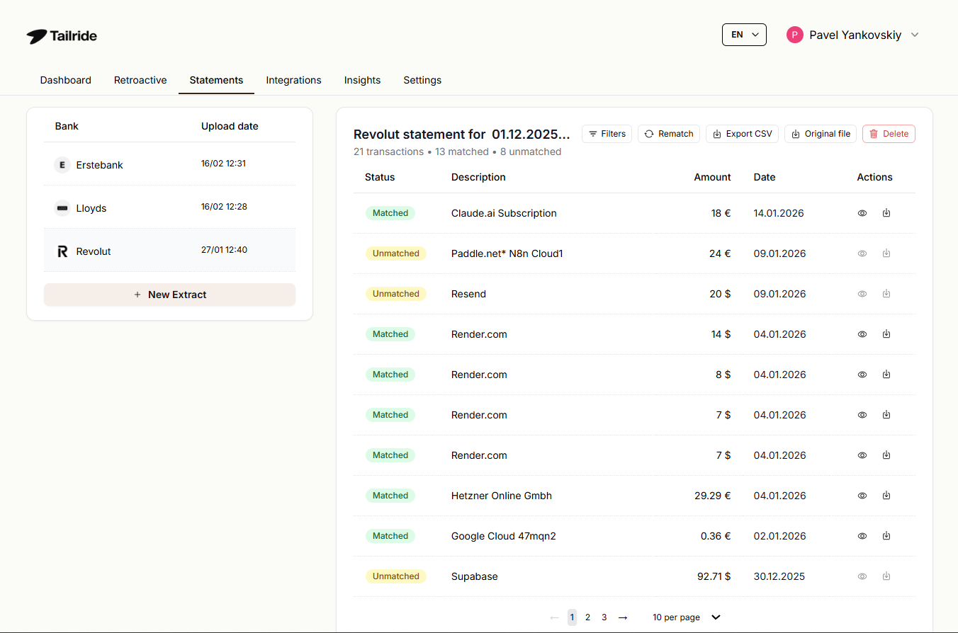 Upload bank statements in PDF or CSV format. Tailride’s AI then matches transactions against extracted invoices, identifies missing documents, and handles multi-currency matching on its own — for instance, USD expenses against EUR bank transactions.