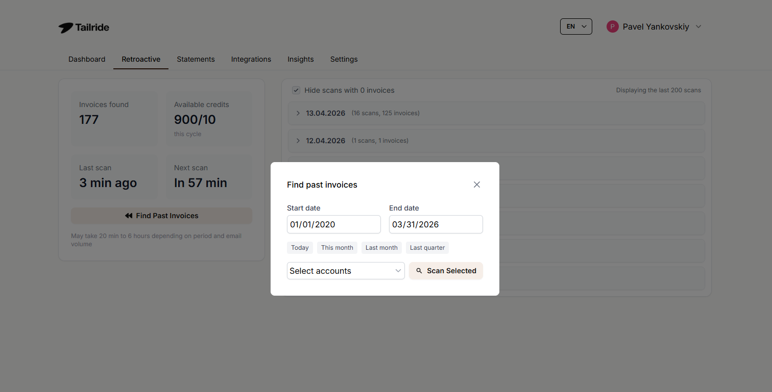 In particular, Tailride’s retroactive scanning is valuable for fast-growing companies — for example, you can recover all historical invoices from a custom date range, including “All Time,” in a single automated pass. No manual downloads, no inbox digging.