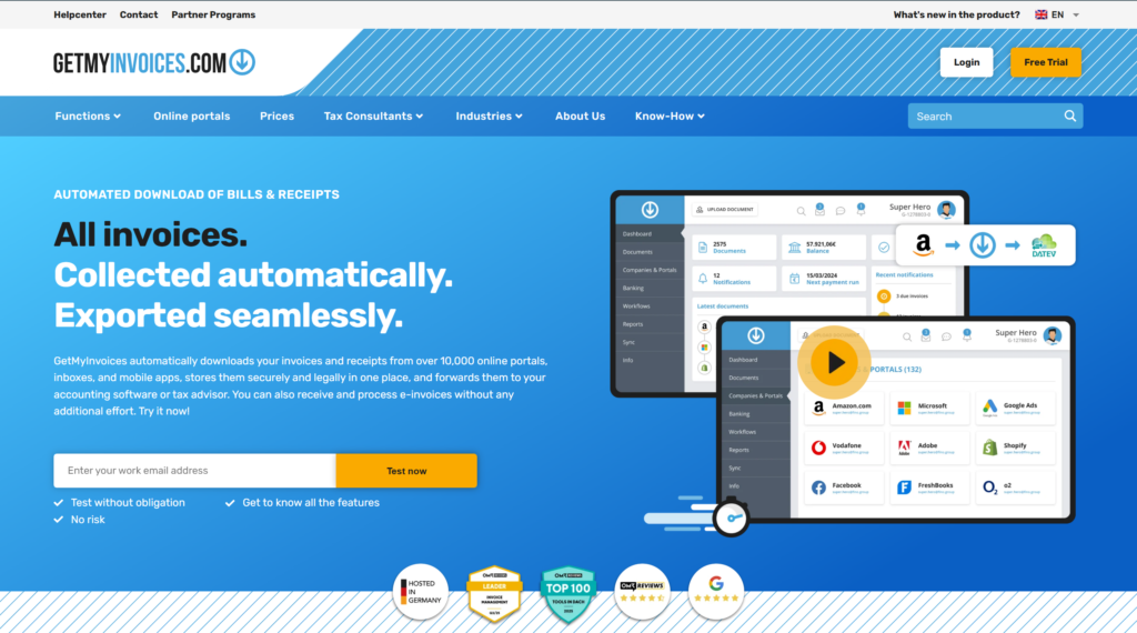 GetMyInvoices ist ein etabliertes Tool zum Abrufen von Rechnungen, das automatisch Rechnungen von Tausenden von Online-Portalen herunterlädt, Dokumenten-Workflows verwaltet und sich in eine breite Palette von Buchhaltungssoftware integrieren lässt. GetMyInvoices ist auf den europäischen Märkten stark vertreten, insbesondere in Deutschland und auf den in der EU ansässigen Lieferantenportalen, und bietet robuste Funktionen wie mehrstufige Genehmigungsworkflows, GoBD-konforme Dokumentenarchivierung und Export in ERP- oder Buchhaltungssysteme.